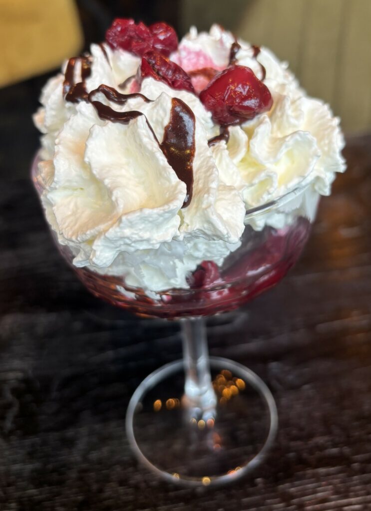 9.90€Mi-cuit chocolat, griottes, crème de cerise, glace amarena et crème fouetté